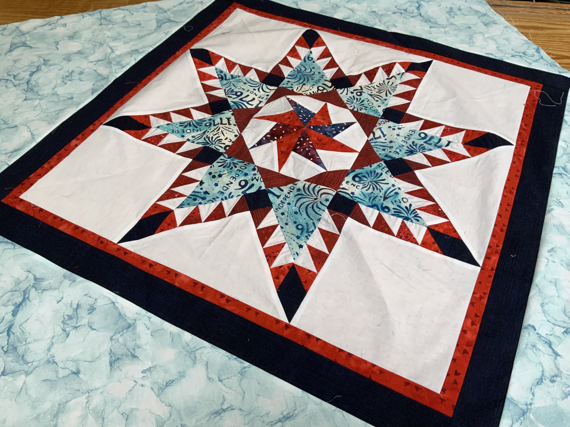 An original design by Laura Shotwell, features a feathered star medallion, set on-point in the center of the quilt. There are foundation pieced New York beauty blocks, a border of sampler blocks that relate to the founding of our country, and other pieced borders.